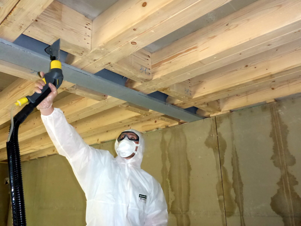 Neben der fachkundigen Erkennung des Risikopotenzials, das erhebliche Baustoffkenntnis voraussetzt, sind die Maßnahmen der Dekontamination natürlich das wichtigste. Hier gilt der Grundsatz erst die unbetroffenen Bereiche zu schützen, dieses wird z.B. durch Abschottung mit Unterdruckhaltung und Bildung von Schleusen (Schwarz- / Weißbereiche) im Bedarfsfall sichergestellt. Danach schließt sich die Behandlung der betroffenen Bereich direkt an. Häufig genügt es erst einmal den Befall zu entfernen und Maßnahmen der Desinfektion sofort durchzuführen, damit sich ein möglicher Befall nicht ausweitet. Generell gilt der Erhalt von Bauteilen um aufwendigen Rückbau zu vermeiden. Unsere Techniker sind auf besonders anspruchsvolle Maßnahmen der Dekontamination speziell geschult und können z.B. Dämmschichten mit Desinfektionslösung voll desinfizieren, aber auch Bereiche mit anderen Verfahren behandeln, um kostenträchtigen Rückbau zu vermeiden ( Dämmschichtdesinfektion ).
