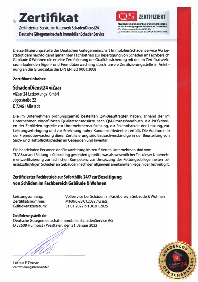 Die Qualität der Ausführung und das konkrete Vorgehen zur Umsetzung Ihrer Rettungsobliegenheiten bestimmt letztlich Ihre Zufriedenheit. Unser Unternehmen setzt daher auf konsequente Qualitätssicherung. Unsere Fachabteilung zur Soforthilfe bei Wasserschaden ist zertifiziert. Wir führen zyklische interne Audits zur Qualitätskontrolle im Rahmen unserer Eigenüberwachung, sowie jährliche Audits zur Fremdüberwachung über unsere verbandseigene TÜV-Rheinland geprüfte Zertifizierungsstelle als externe Überwachungsorganisation durch. Profitieren Sie von unseren hohen Servicelevels.